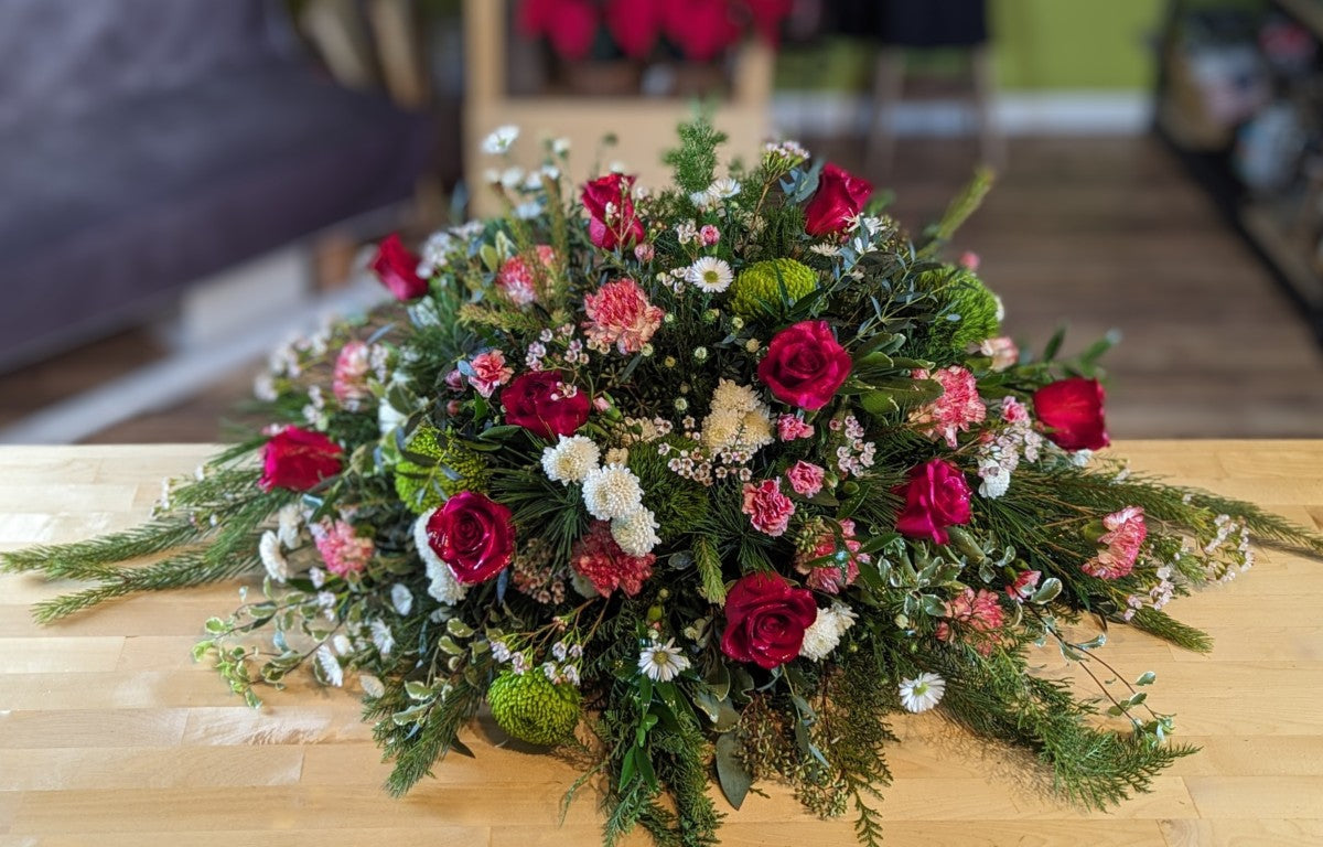 Please keep in mind that the photos are for reference only, that each casket spray is custom and created for you at the time of your order. Flowers will vary based on availability and season. If you need something specific, call or order with enough time in advance for us to source your request -- the more time you can give us, the more we are able to accommodate your customizations.