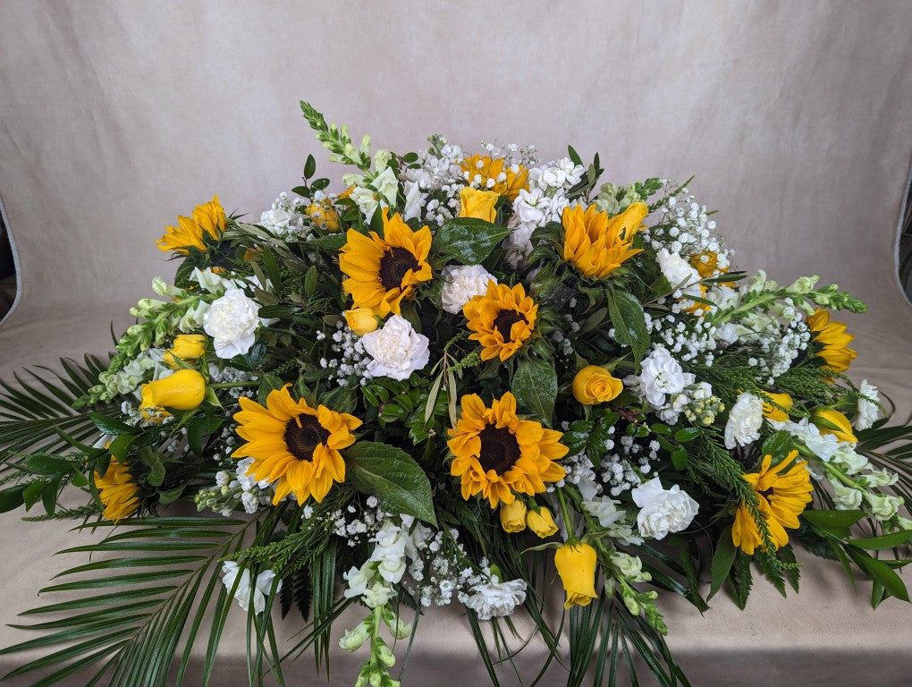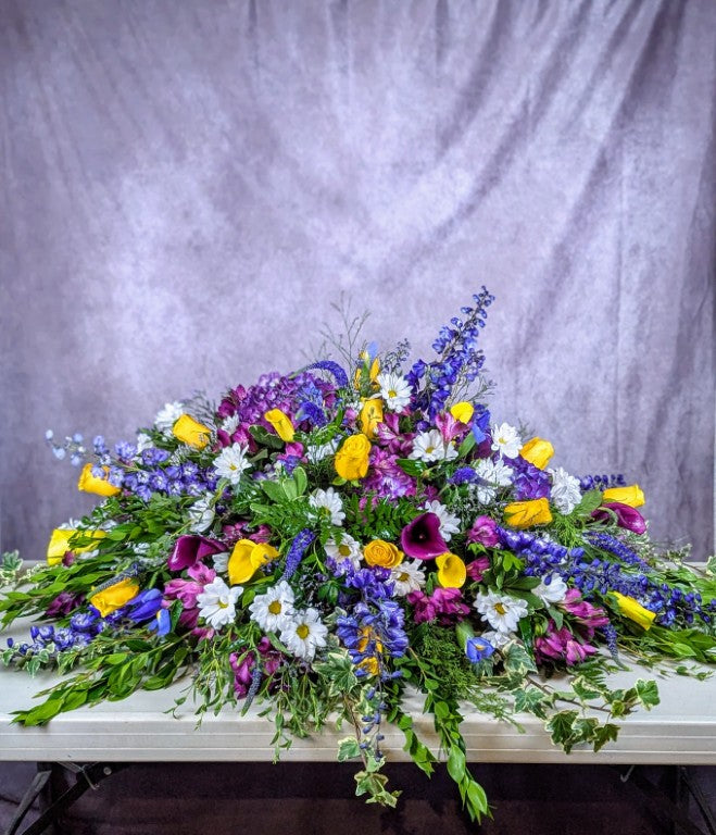 Casket sprays are elegant floral arrangements designed to rest atop the casket, serving as a beautiful centerpiece during a funeral or memorial service. Created with care and respect, they are a heartfelt tribute that honors and celebrates the life of a loved one with timeless beauty. If you don't see what you are looking for, call for additional sizes, colors, or customization; we're always happy to help: 661-557-5083